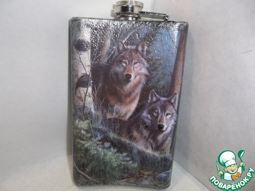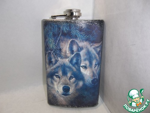 А фляжку сначала хотела сделать с какой нибудь красоткой,а потом все же остановилась на волках.