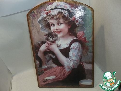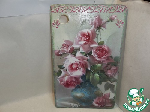Ну я как всегда со своим декупажем. Хочу показать очередные свои работы. Это обычная деревянная досочка. На ней с обратной стороны можно хлебушек резать.
