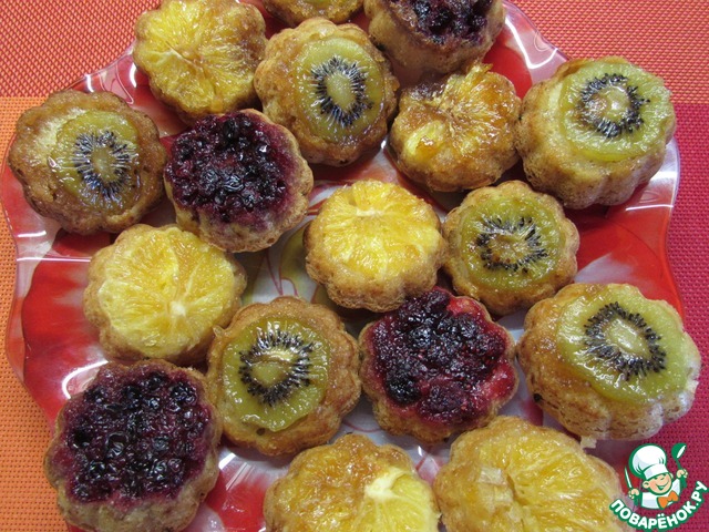 Очень вкусно! Готовила с брусникой, малиной, апельсином и киви. Все варианты начинки отлично подошли к тесту. Лучше все выпекать в силиконовых формочках, чтобы при вынимании из них можно было как бы вывернуть форму, чтобы ягоды и фрукты не остались на дне. Я часть запекала в маленьких формочках, а оставшееся тесто выложила в большую, естественно увеличив время до 45 минут.