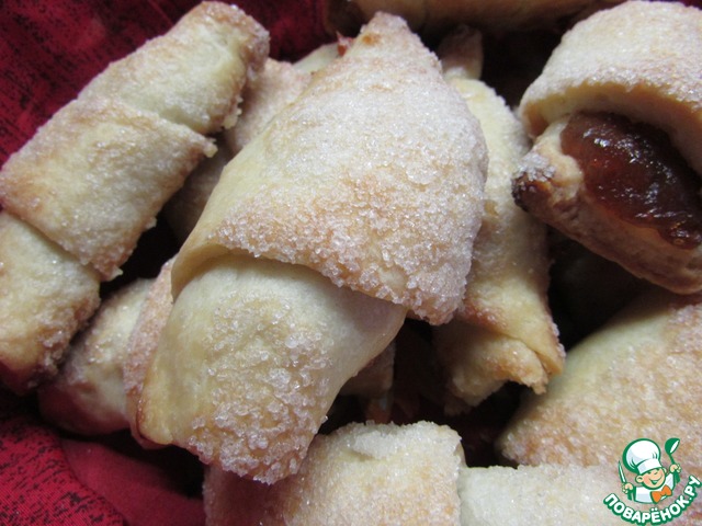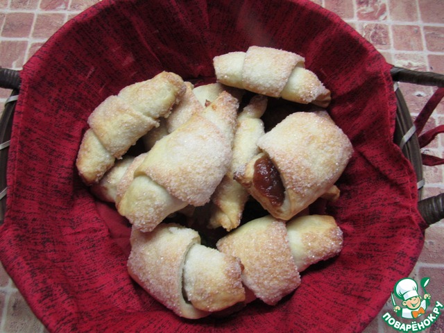 Практически из простых продуктов получаются вкусные рогалики. Верх рогаликов обмакивала в сахар. Так румяней и аппетитней. С тестом было очень приятно работать. Начинка – яблочное повидло.