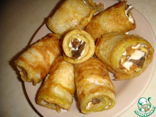 Кабачки обжарила в яйце, смазала майонезом и свернула рулетиками с жареными грибами