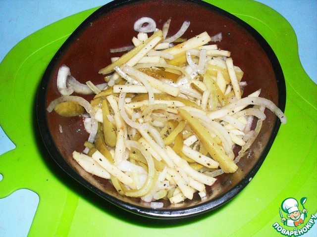 А вот "Салат-закуска"Сметут сразу" https://www.povarenok.ru/recipes/show/119458/,тоже Женечки,нас с мужем разочаровал...Позарившись на массу отменных откликов,на высокий рейтинг рецепта,я спокусилась приготовить салатик,но .....Я не в претензии к Жене и другим поварятам,которые лестно отзывались о салате.Здесь,все-таки,имеется масса нюансов,которые могли повлиять на конечный результат.Огурцы маринованные у каждого свои,да и сорт яблок брали разный,поэтому и вкус разный.Но я все равно его (рецепт) оставляю в заметках и буду экспериментировать еще.