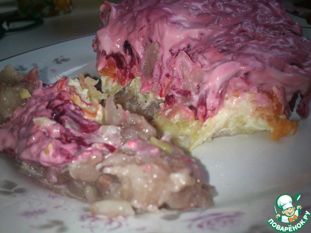 Необычная селедка под шубой. пожалуй, буду теперь готовить только так. не нужно по часу косточки вынимать(я на этот случай очень придирчива). единственная поправка для тех, кто будет готовить: не надо измельчать лук вместе с селедкой-он даст сок и горчинку. а вот меленько его порезать и добавить в селедочный фарш-самое то! по вкусу мне такая селедочка пришлась. а муж со вздохом сказал, когда брал последний кусочек: быстро как закончилась.... а я то 2 порцию брала!