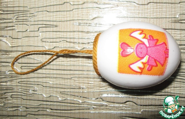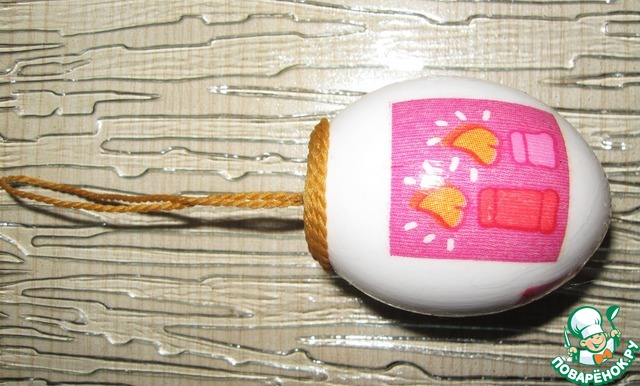 Пыс пыс: Про изготовление хочу сказать, что яйца пустые. Я их вскрывала с тупого кончика, выливала, промывала и сушила. Потом обклеила яйца картинками. К тупому кончику приклеила шнур и сделала петельку.