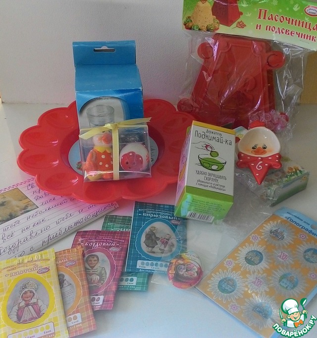 Галинка мне прислала чудесную форму для творожной пасхи (уже "надергала" рецептов у поварят, обязательно приготовлю!), набор красок и наклейки для яиц, пасхальную тарелочку и нежный магнитик "Светлой Пасхи"
