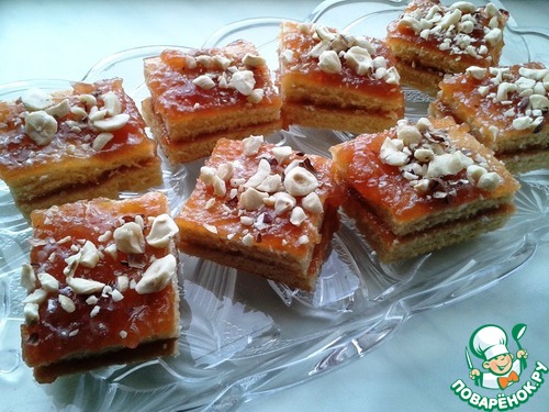 Великолепное и очень вкусное печенье! Легко и быстро готовить (быстрее, наверное, и не бывает!). Готовила с яблочным повидлом, сверху фундук и в два слоя. Но, к сожалению, одной порции мало! В следующий раз двойную порцию буду делать!