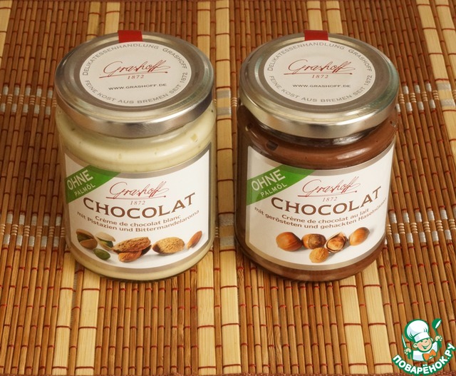Просто обалденно вкусный Шоколад в банке, по сути это шоколадный крем, но очень качественный и вкусный. Белый с фисташками и миндалем, другой - молочный шоколад с орехами. Белый брала себе, очень ароматный, вкусный, в меру сладкий, я в полном восторге. молочный брала мужу, пока не пробовал, бережет