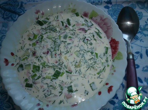 вот она,красавица. Рецепт для тех, кто не любит окрошку на квасе или кефире. поварята,которые всеми конечностями против майонеза, конечно, не поймут. но я кушаю окрошку только в таком варианте. как оказалось, не я одна просим хозяев :