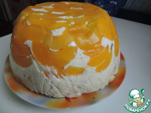Но и обычный торт мы тоже испекли. когда сын попросил торт"как у папы и что бы с персиками", я вначале немного расстроилась, я подбирала торт новый,еще не опробованный, НО ! зато я испекла только бисквит, а крем, нарезка фруктов, бисквита, украшение формовка-делали дети. это торт поистине семейное сокровище.Крымский заливной