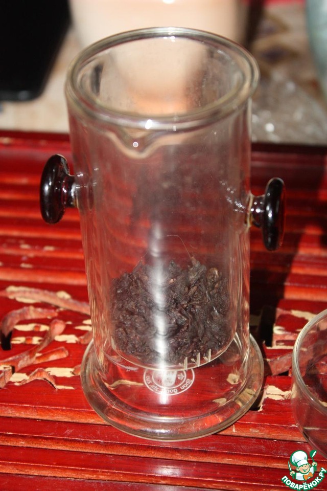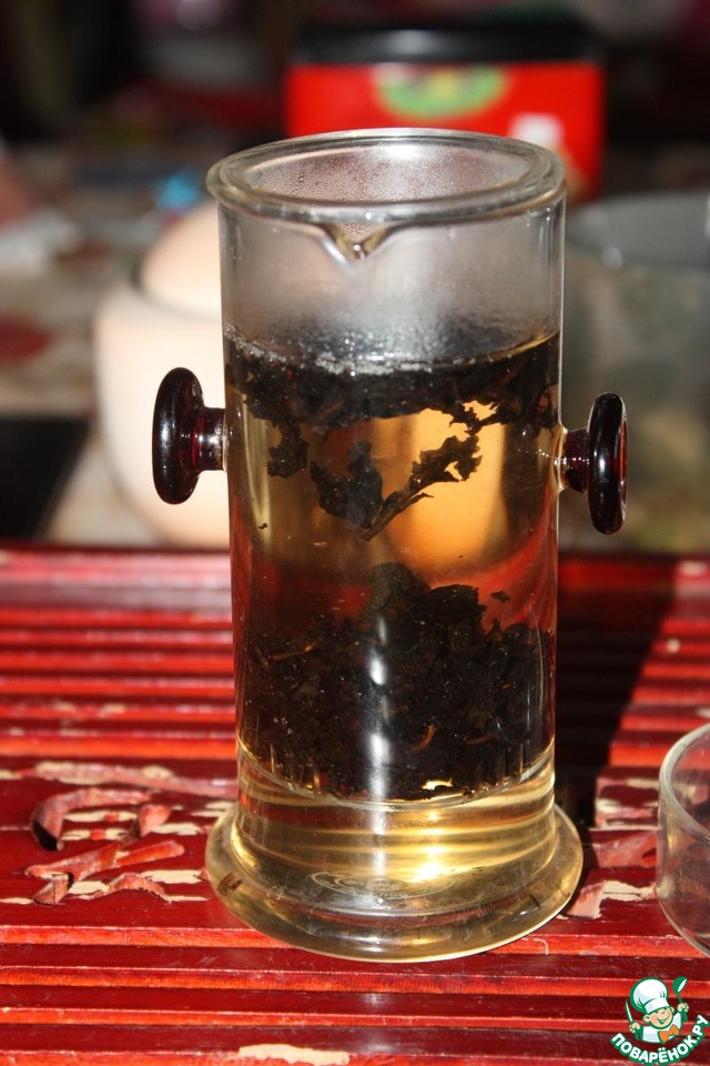Крышку можно использовать как чахе - чашу для знакомства с чаем. Тут мы впервые можем почувствовать тот самый дымный аромат и полюбоваться на красивый черный чайный лист.