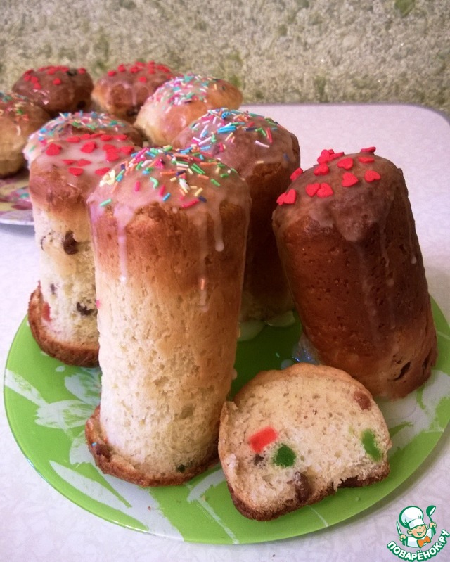Привлекла меня технология: замесила тесто в пятницу вечером, после работы. В субботу утром разделала и к 12 уже пекла. Правда, формочек для куличей у меня нет, делала из подручных средств (фольги и картона), поэтому некоторые куличи у меня напоминают пизанские башни... Оставшееся тесто пекла в формочках для кексов. Тесто действительно легкое и в то же время не сухое. Специально сделала разрез, чтоб видно было текстуру. А главное, бесхлопотное, что в праздник очень важно. Покрывала лимонной глазурью.