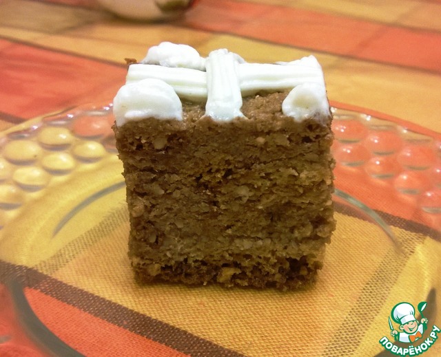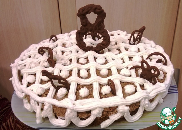 Готовила сыну на восьмилетие. Порадовала простота приготовления. Пришлось использовать арахис, поскольку заначенная баночка грецких орехов неожиданно оказалась испорченной . Бисквит отлично поднялся, правда, муж перепугался, когда я начала его кромсать и крошить - думал, что это я с досады, что не получился
