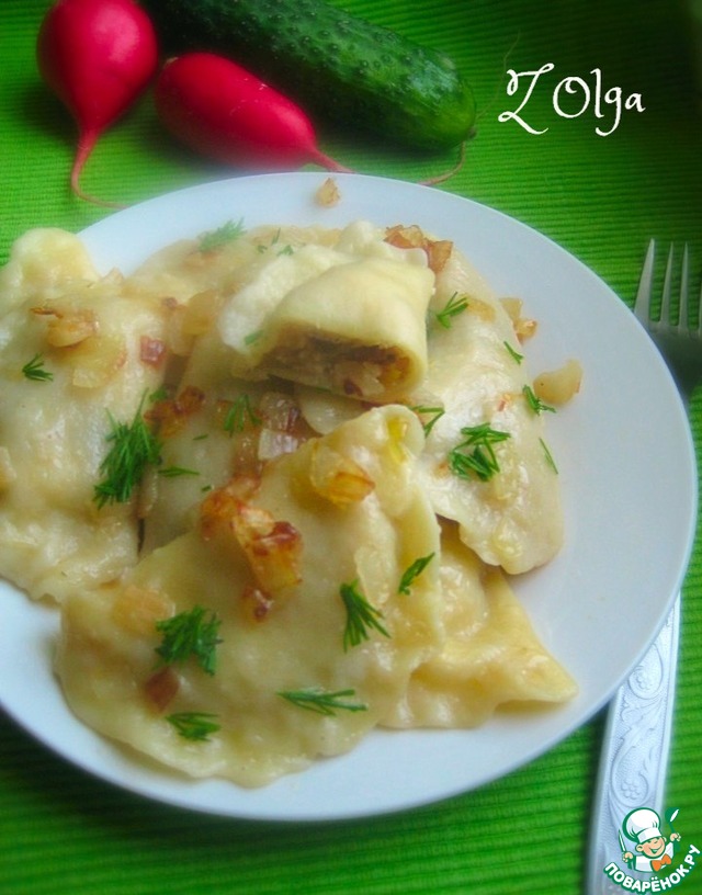 «Вареники с фасолью, картофелем и творогом» https://www.povarenok.ru/recipes/show/126819/ по рецепту Светочки diana1616! Начинка очень понравилась, правда у меня фасоль красная! А тесто - это просто откровение для меня! Такое послушное, податливое, абсолютно не требует подпыла муки ни при раскатке, ни при лепке вареников!