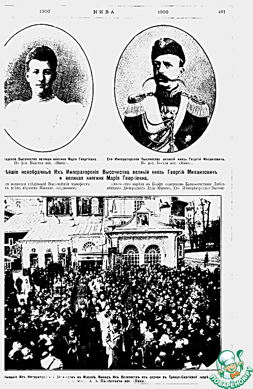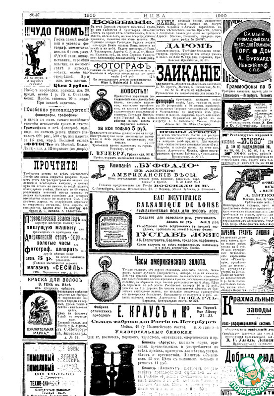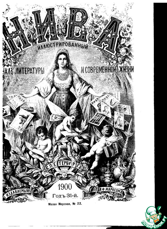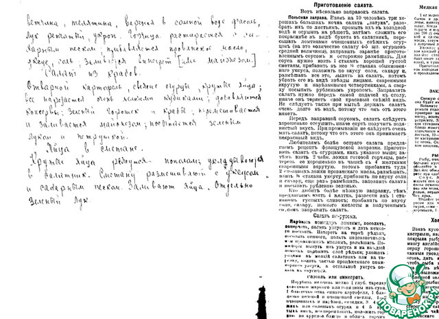 Рецепты вырезались из модных журналов и газет. У меня до сих пор хранится тяжеленный том переплетенных журналов "Нива" за 1900 й год. Там печаталось всё-и исторические эссе, и модные романы, и заметки о разных странах, политика,светская хроника, дамские моды, рецепты, объявления. Примера ради покажу несколько страниц.