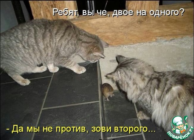 а где два котофея и мыша- вспомнила. у меня мои немцы второй день по участку кролика гоняют. кролик здоровенный(больше кошки) -сбег у кого то из соседей. они его за забор загонят, а он минут через 10 обратно лезет- в догонялки с овчарками поиграть