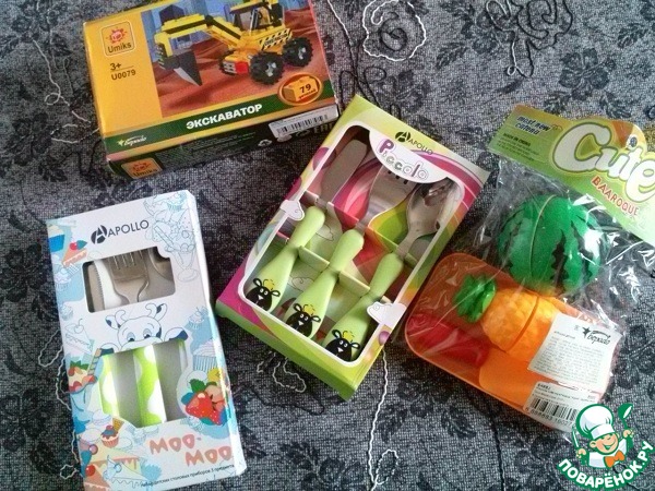 Подарки мои детям: столовые наборы, для дочки набор фруктов, для сына экскаватор