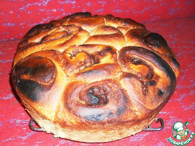 Пекла его два раза.Это была катастрофа!!!!Поскольку все кулинарные эксперименты я провожу на даче,то естественно и в этот раз помощницей при выпечке была моя "Чудо-печка".В общем,первый раз я его делала,как и описано в рецепте-в форме(правда форма короче,чем у Маши),резала на 5 рулетиков...Вся эта красота ТАК поднялась,прилипла к крышке печки....пригорела,а середина совсем сырая.Я его)хлеб) перевернула,допекла низ.Потом верх горелый обрезала,остальное съели с мужем.Но все равно покой был нарушен.Во второй раз я решила отступить от рецепта в плане формовки и разрезала на большее количество рулетов,выложила просто по кругу.Но он все равно получился "негрой",немножко...Но очень вкусный сладкий,ароматный шоколадный хлеб!!!Тесто очень нежное,мягкое...Вот буду повторять еще и в духовке.