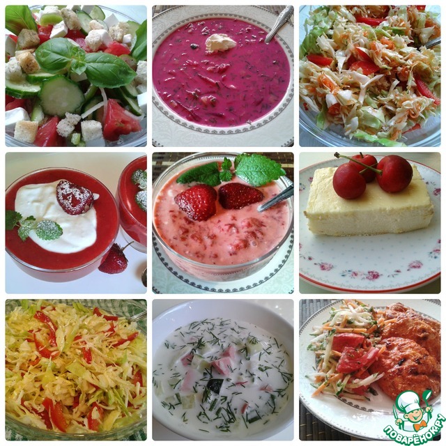 Красочные салаты, супчики! А уж десертики с клубничкой вообще красота!!