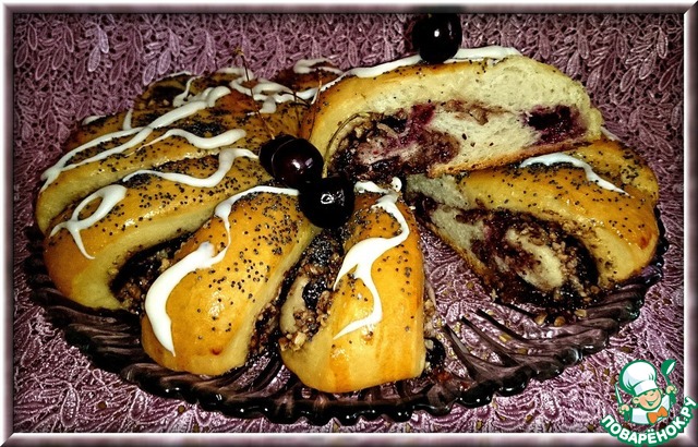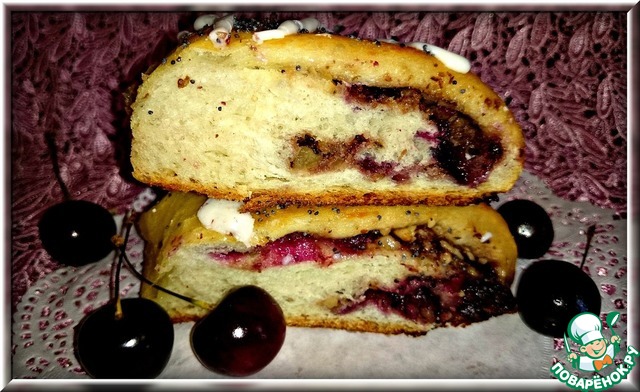 А это мой любимчик! Рулет с черешней и орехами...Уже не помню,сколько раз готовила его.Рулет неземного вкуса!Нежнейший,воздушный,а какой витает аромат во время выпечки!На одном-двух кусочках остановиться просто невозможно!