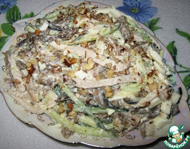 Очень интересный и вкусный салат! Компоненты самые простые и доступные, у нас всегда имеются в холодильнике вешенки, очень удачное сочетание! Сверху от себя посыпала орешками.