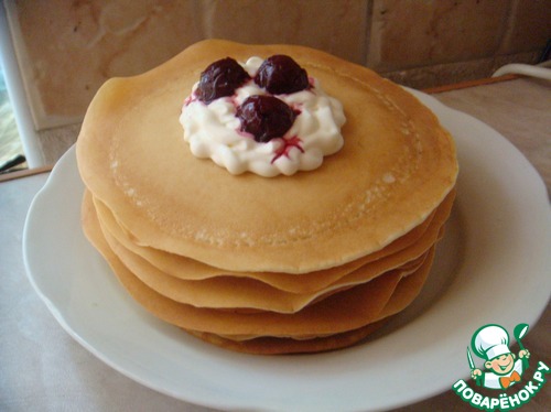 Наверное по моим отчетам можно догадаться, что мы любители по утрам на завтрак поесть всякие оладушки и панкейки. Очень вкусные панкейки! Использовала домашнее прокисшее молоко, муки чуть больше ушло. Со сметанкой и вишенками самое то!