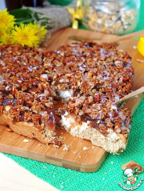 Это один из самых вкусных для меня пирогов! В нем очень вкусны и гармоничны ВСЕ слои, но изюминка (вернее гранолинка) этого пирога-хрустящая гранола! Она восхитительна и очень украсила этот пирог! Яблочные дольки я взяла готовые, очень сладкие, из яблочного варенья и поэтому сильно уменьшила общее количество сахара в твороге и тесте.