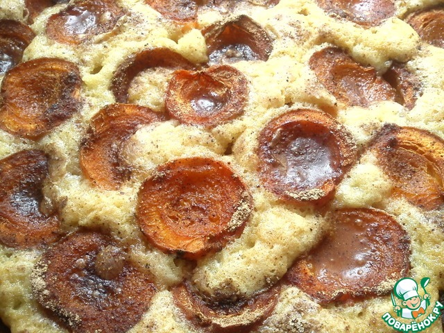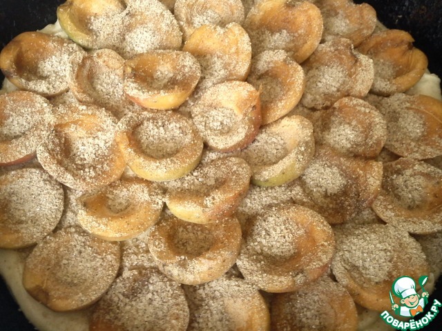 Дальше отвлекаться было уже нельзя - быстро выложила тесто, на него половинки абрикос и присыпала сахаром с корицей.