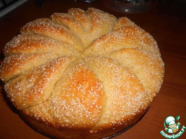 Чудесный хлебушек! Очень удобно отрывать лепешку и кушать. Мягкий, воздушный, с кунжутом! Что еще нужно для сытного обеда и счастливого желудка! Жаль одно-быстро исчезает... Надо печь сразу два, а то и три... Да и, как вы сами видите, даже внешний вид прекрасен! Как можно пройти мимо такого милашки?