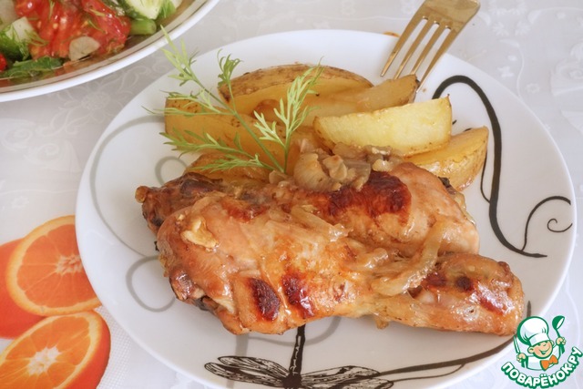 У меня не бедра а голени, мариновались всю ночь, не обжаривала, сразу поставила запекать, получилось великолепно!