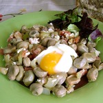 Ингредиенты: Бобы, Ветчина, Лук репчатый, Яйцо куриное, Масло оливковое, Соль.