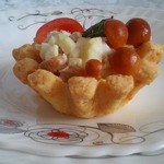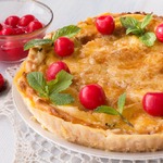 Ингредиенты: Мука пшеничная, Масло сливочное, Сыр твердый, Желток яичный, Соль, Грибы, Яйцо куриное, Яблоко, Лук репчатый, Сметана, Помидоры черри, Петрушка.