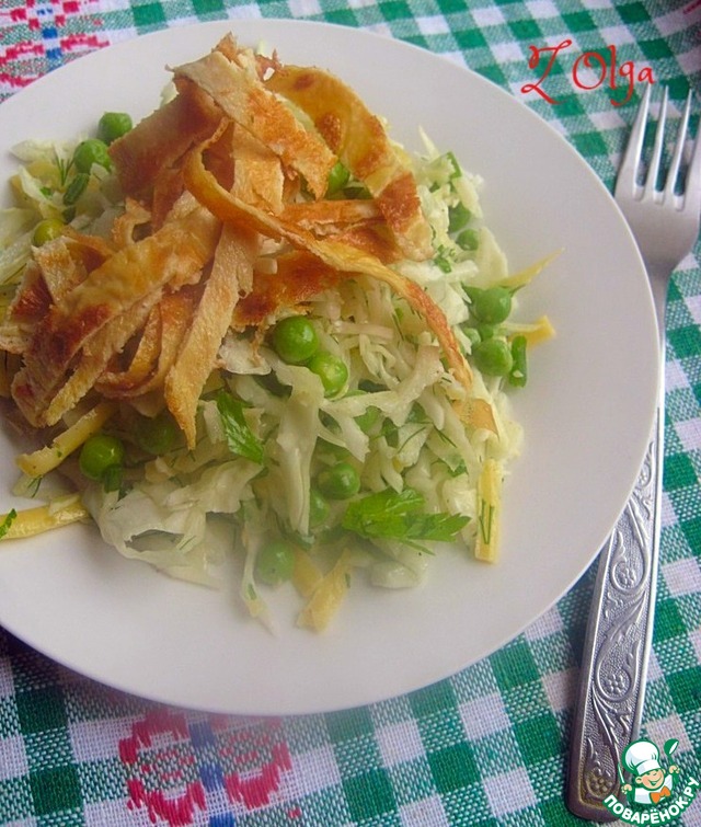 Зеленый салат с омлетом https://www.povarenok.ru/recipes/show/127363/ по рецепту Оли Демурия! Вкусный и сытный салатик! Горошек использовала свежий, а к укропу добавила еще петрушку с зеленым луком))).