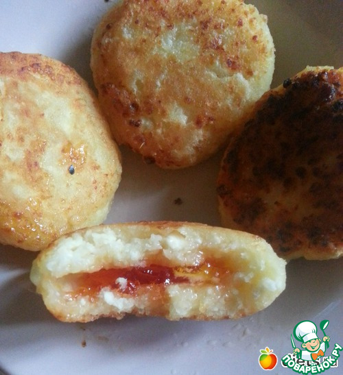 Мокрыми руками сформировать небольшую лепешку толщиной около 1 см, в серединку положить кусочек шоколада (мармелада или 1 ч. л. сгущенки, джема), свернуть края лепешки так, чтобы получился сырник, и начинка была полностью закрыта.