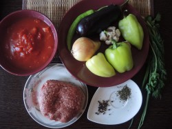Подготовим все ингредиенты. На этом фото всего один баклажан, так как остальные уже порезаны и отмачиваются с солью.