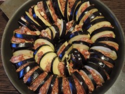 Поверх выкладываем кружки баклажанов поочерёдно с фаршем. Баклажаны перед этим следует промыть холодной проточной водой и немного обсушить.