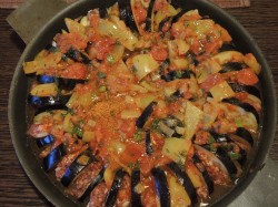 Готовое блюдо извлекаем из духовки. Посыпаем небольшим количеством порубленной зелени и пластинками чеснока. Закрываем крышкой и даём "отдохнуть" примерно полчаса, чтобы блюдо напиталось ароматами зелени и чеснока. Подавать баклажаны по-турецки с фаршем можно и как самостоятельное блюдо, и с гарниром - например, с лапшой. Приятного аппетита!
