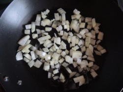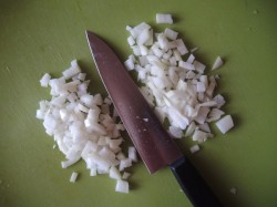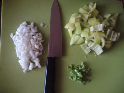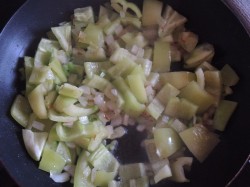 Ко второй части добавляем мелко-мелко порезанный перец чили и порезанный кубиками болгарский перец. Из этих овощей будет приготовлен соус для нашего блюда.