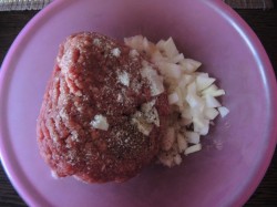 Одну часть лука соединяем с фаршем, солью и черным перцем.
