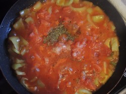 Добавляем томаты и мяту. Продолжаем тушить ещё 5-7 минут.