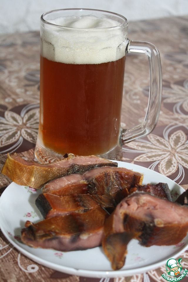 Пиво сорт Пилснер из ячменя (тоже кстати смелен собственноручно)и лосось холодного копчения (солили и коптили сами)