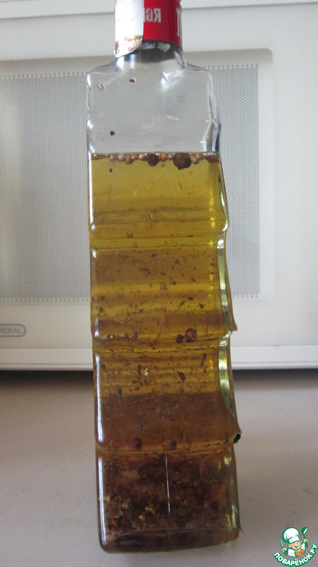 стоит настаивается, но уже появляется аромат, добавляла в салат, очень вкусно, бутылка новогодняя с картинкой, в анфас никак не позирует-))
