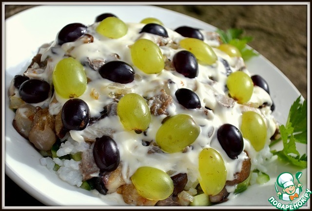 Я делала без сыра, и потому салат, конечно, немного потерял во вкусе. Представила, что с сыром будет намного лучше, тем более, что сыр отлично сочетается с виноградом. Но!.. (опять это "но" ) И так салат оказался достаточно вкусным: свежим, сочным. Грибочки у меня подберёзовики да белые: красота!.. Так что, автору спасибо за рецепт