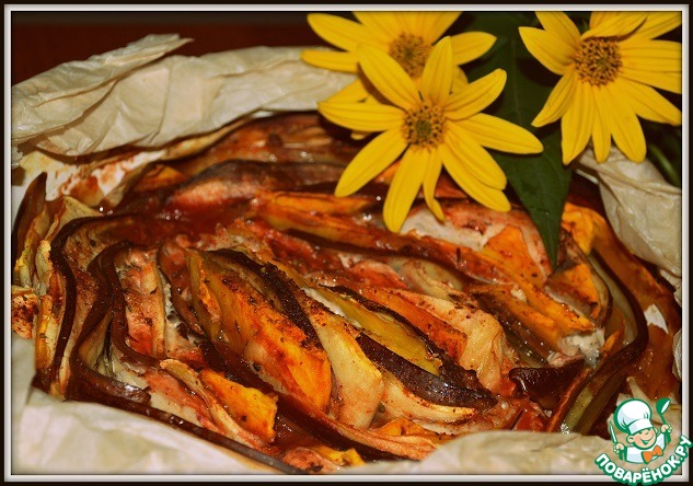 Очень красивая затея!.. Я немного отступила по рецепту: но только в качестве специй (поменяла на другие), лук не добавила и положила курочку такими же пластиками. Очень вкусное сочетание, да и овощи все прекрасные: тыква, баклажан да кабачок. С ними курочка просто порхает!..