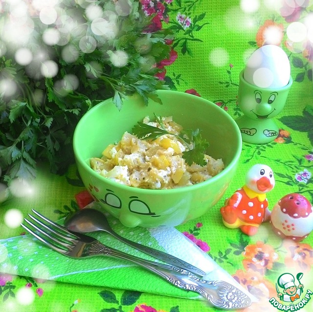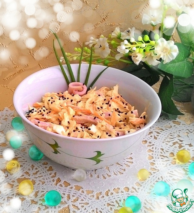 Вкусный и интересный салатик! Простой в приготовлении. У меня заправка из сметаны, горчицы и соевого соуса. Посыпала калинджи. Нам понравилось!