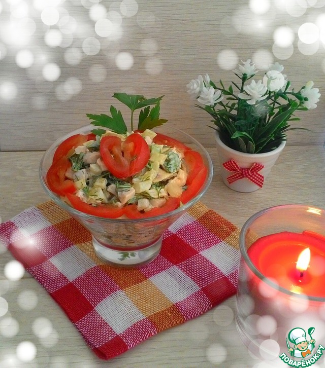 Я тоже влюбилась в этот салатик! Яркий вкус копченой курочки, нежность омлетика и хрусткий свежий перчик! Мммм... У меня перчик зеленый, поэтому для яркости украсила помидоркой, она там тоже хорошо вписалась! Заправка - сметанка с горчицей и соевым. Спасибо за вкуснейший рецептик!
