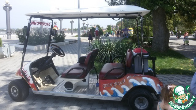 Покатались на электромобиле. Экскурсия по всей Набережной была. А потом еще поехали в Ореховую рощу. За дополнительную плату, разумеется. Но зато мы были вдвоем в Лялей и нас водитель даже по улицам провез города, где не проводит экскурсии. Вот наша машинка: