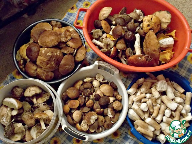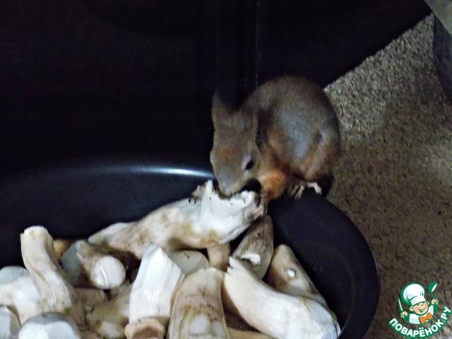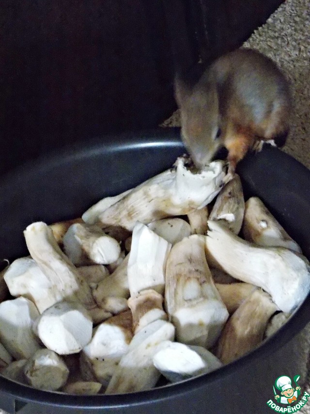 Естественно, что первым делом я их перебрала, рассортировала, оторвала ножки и разложила по тазам. И вот тут в игру вступил наш самый главный эксперт по грибам - Фаня. Сначала он проверил все тазы и пытался попробовать каждый гриб в отдельности.