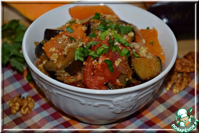 Необыкновенно удачное сочетание тыква+баклажан. Даже не ожидала, очень приятно удивлена. Да и в целом блюдо восхитительное:ароматное, яркое, слегка пикантное, конечно же, ВКУСНОЕ. А как к месту здесь грецкие орехи! (минус один-ешь и хочется ещё и ещё) На сегодняшний день этот гарнир/закуска/салат с тыквой занимает первое место в нашем меню.