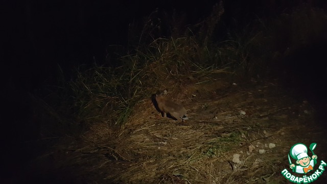 Итак, мы поехали обратно. Уже стемнело и на обочине вдоль лесов часто мелькали, горящие в свете фар глаза лис. За несколько километров до дома друзей, дорога становится похожей на стиральную доску, поэтому мы едем со скоростью не более 50км/ч. Вдруг муж увидел что-то непонятное на дороге... Подъехав ближе, мы увидели зайца!!! Причём он ни в какую не хотел уходить с дороги. Нам пришлось остановиться. Я даже смогла его сфотографировать... С трудом мы прогнали его с дороги, чтобы машина не сбила ушастика. Издалека он казался зайчонком, но вблизи оказался вполне взрослым зайцем...