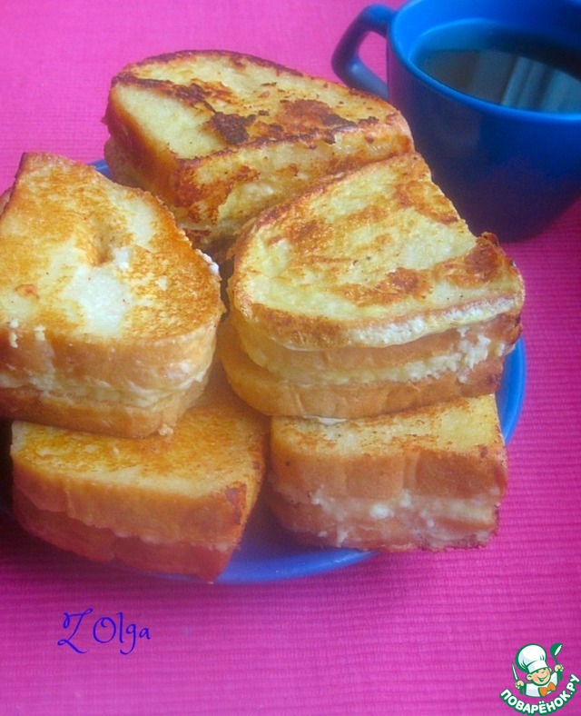 Быстрые творожные гренки https://www.povarenok.ru/recipes/show/131589/ по рецепту Алены a shvedova77! Отличная идея для завтрака! Начинка у меня – творог, мед и ванильный сахар! Обязательно буду повторять это блюдо!